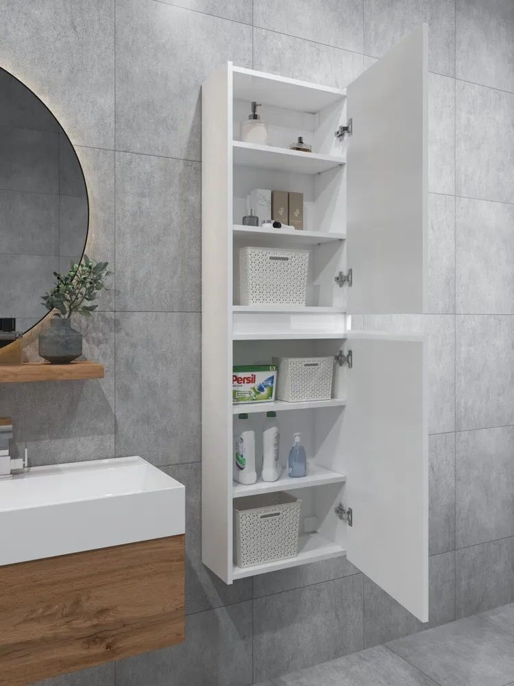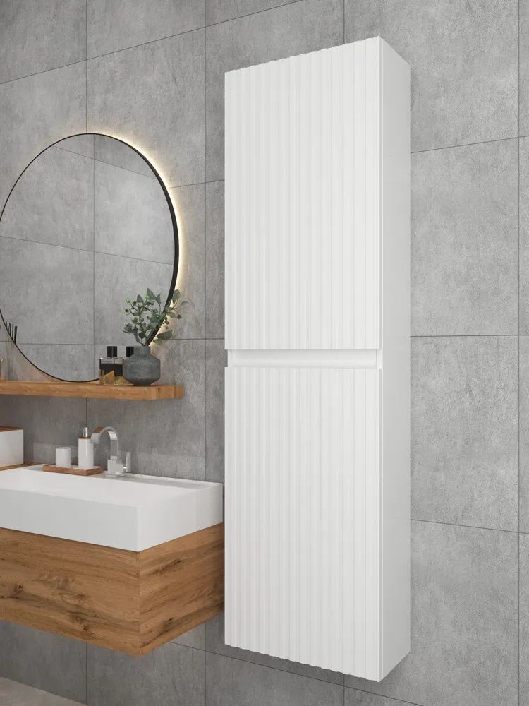 Белый шкаф пенал с рифлёным фасадом будет отлично и стильно смотреться как в ванной, так и в туалете. Шкаф пенал с полками можно повесить в прихожей, в коридоре и использовать для хранения небольших вещей и мелочей. Такой белый навесной шкаф можно использовать как шкаф навесной в гостиной или как шкаф для детской.