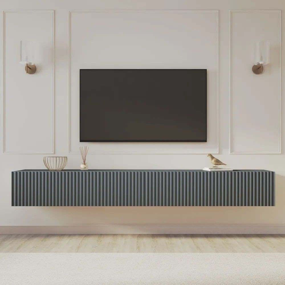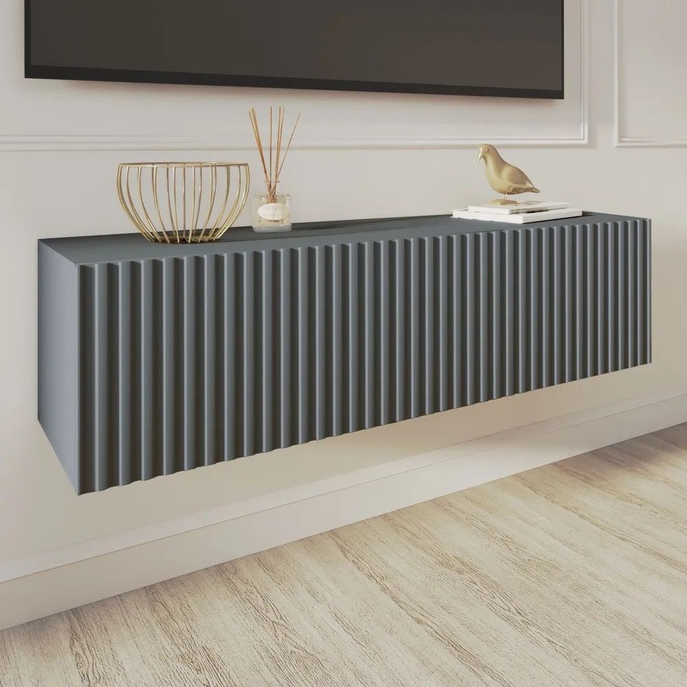 Благодаря своей компактности тумба под ТВ подвесная поможет сэкономить пространство, избежать ощущения загромождённости гостиной, спальни или детской комнаты, а рифлёный фасад будет акцентировать